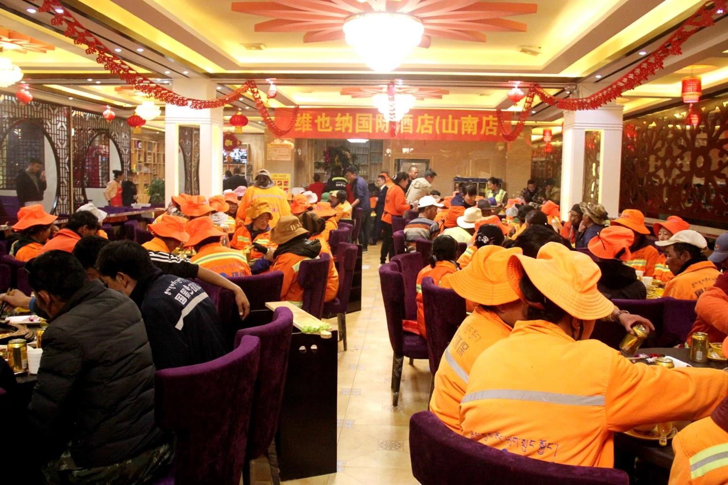慰問活動(dòng)結(jié)束后,主辦方邀請(qǐng)所有環(huán)衛(wèi)工人同吃火鍋宴。秘制火鍋湯料,冒著熱氣兒,散著香味兒,開胃小菜,各種醬料,時(shí)鮮蔬菜,魚肉等豐盛的菜品讓“城市美容師”們吃的既暖胃,又暖心。