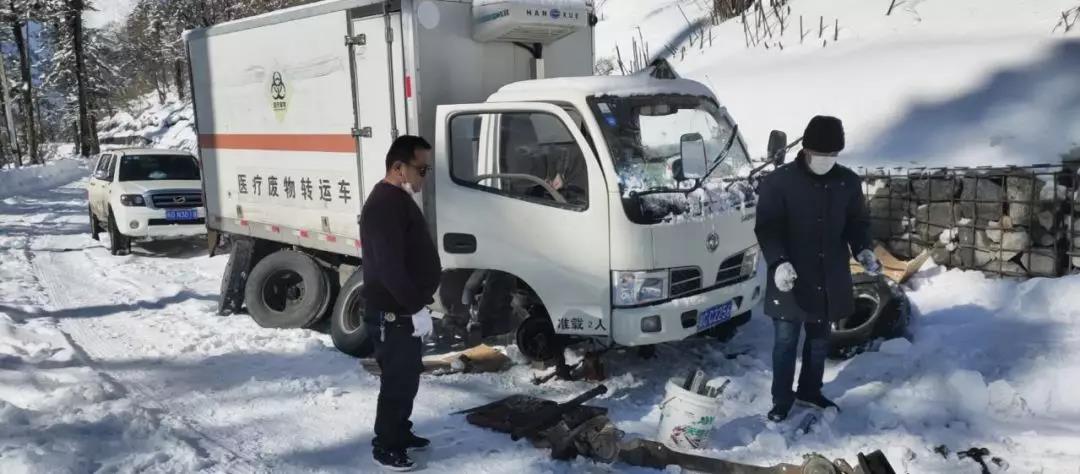 圖為國(guó)策環(huán)保醫(yī)療廢物轉(zhuǎn)運(yùn)車(chē)在轉(zhuǎn)運(yùn)醫(yī)療垃圾途中,因天氣惡劣車(chē)體打滑故障,車(chē)輛被困,正在進(jìn)行維修。