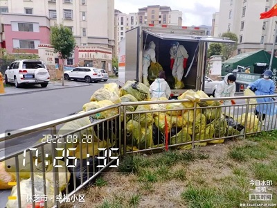 (國(guó)策環(huán)保林芝分公司工作人員對(duì)低風(fēng)險(xiǎn)區(qū)域進(jìn)行生活垃圾清運(yùn))